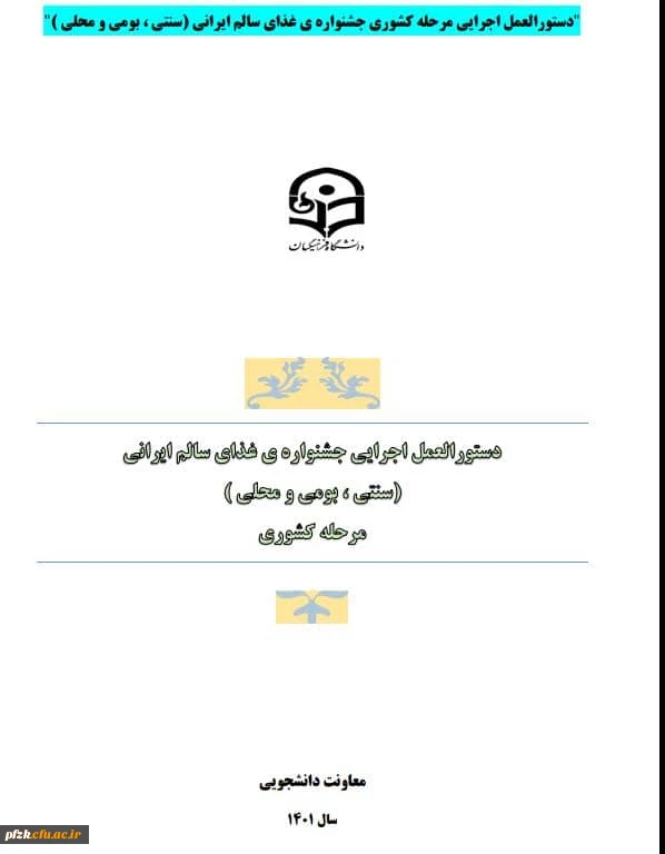 اداره کل برنامه ریزی خدمات و رفاه دانشجویی به استناد برنامه عملیاتی سال1401 در نظر دارد "مرحله کشوری جشنواره سالم ایرانی(سنتی، بومی و محلی)" را در راستای ترغیب دانشجو معلمان به استفاده از غذاهای سالم و بهداشتی و همچنین ارتقاء بینش مهارت های زندگی بر گزار نماید