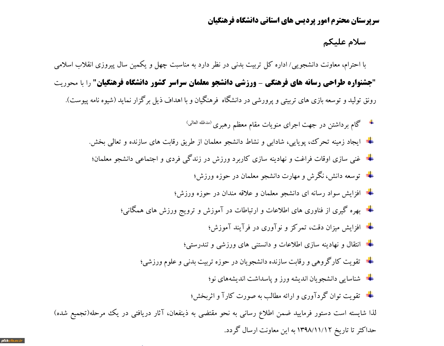 امتیاز دهید : جشنواره طراحی رسانه های فرهنگی- ورزشی دانشجومعلمان سراسر کشور دانشگاه فرهنگیان 4 شنبه 23 آذر 1398 ساعت 13:10