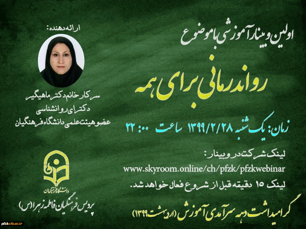 امتیاز دهید : اولین وبینار آموزشی با موضوع :روان درمانی برای همه 2 چهارشنبه 31 اردیبهشت 1399 ساعت 10:35
