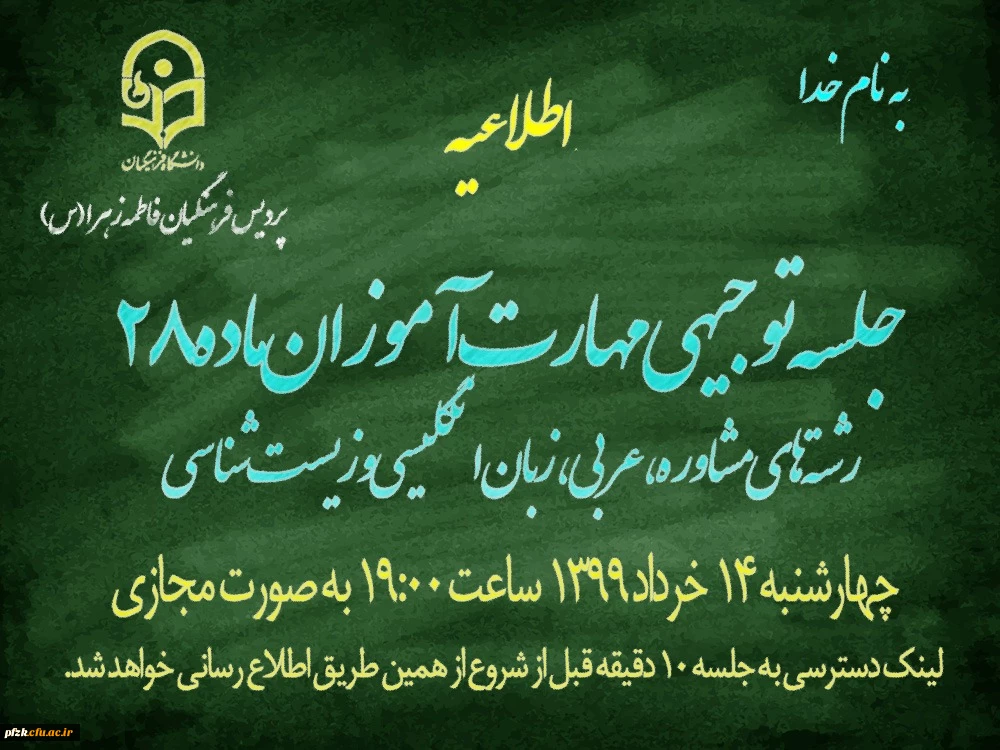 جلسه توجیهی مهارت آوزان ماده 28 رشته های مشاوره ، عربی ، زبان انگلیس و زیست شناسی با حضور مسئولین پردیس فاطمه الزهرا (س) انجام شد . 2