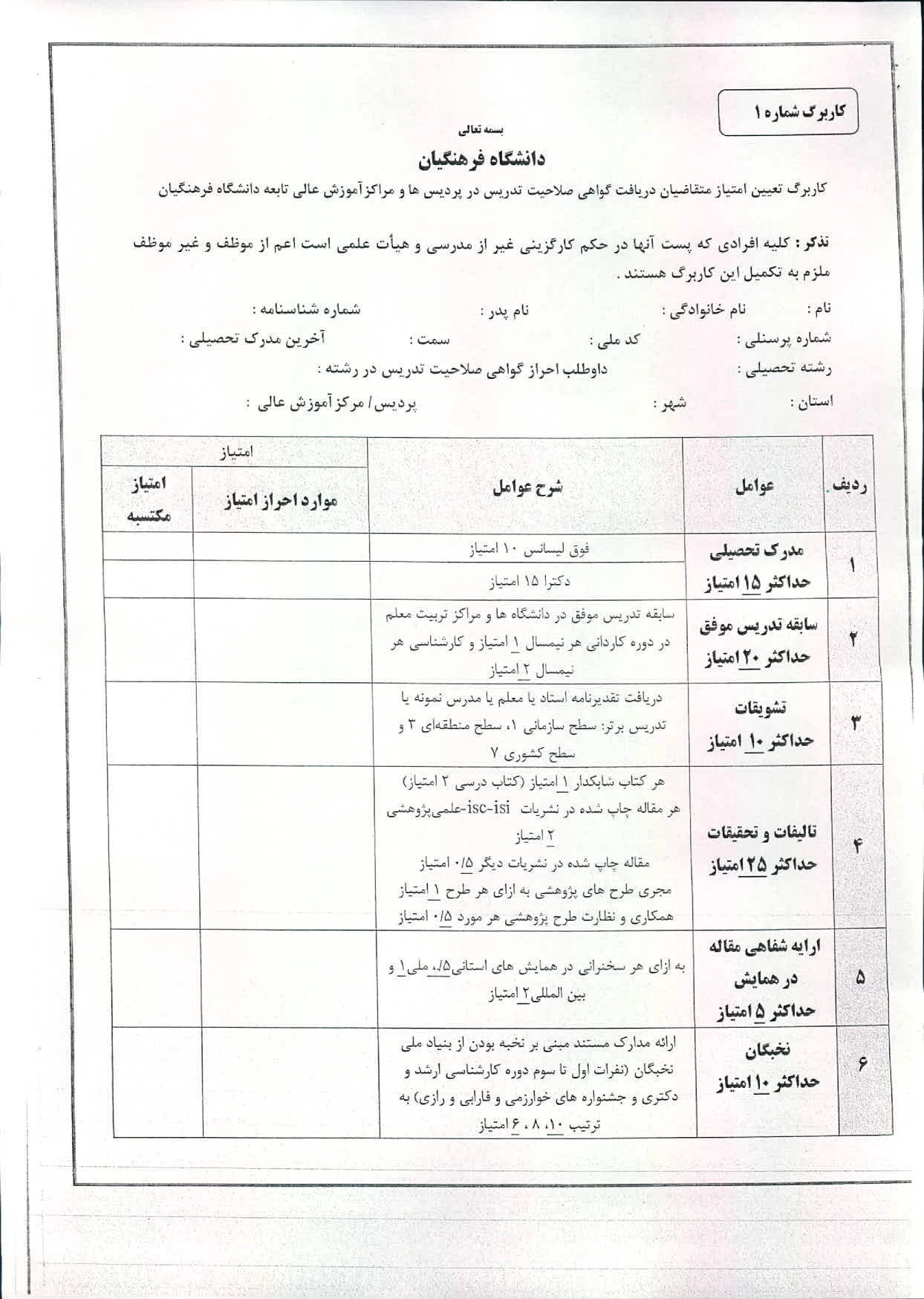 کاربرگ تعیین امتیاز متقاضیان دریافت گواهی صلاحیت تدریس درپردیس ها ومراکز آموزش عالی تابعه دانشگاه فرهنگیان