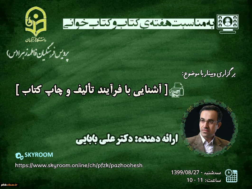 امتیاز دهید : وبینار آشنایی با فرایند تالیف و چاپ کتاب به مناسبت هفته ی کتاب و کتاب خوانی سهشنبه 27 آبان 1399 ساعت 8:50