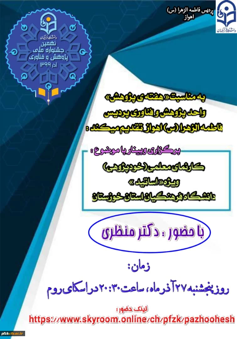 امتیاز دهید : وبینار کارنمای معلمی(خود پژوهی) ویژه اساتید دانشگاه فرهنگیان خوزستان شنبه 22 آذر 1399 ساعت 21:37