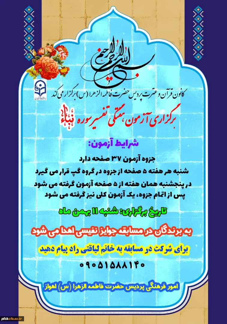 امتیاز دهید : کانون قرآن و عترت پردیس حضرت فاطمه الزهرا(س) برگزار می کند یکشنبه 12 بهمن 1399 ساعت 8:28