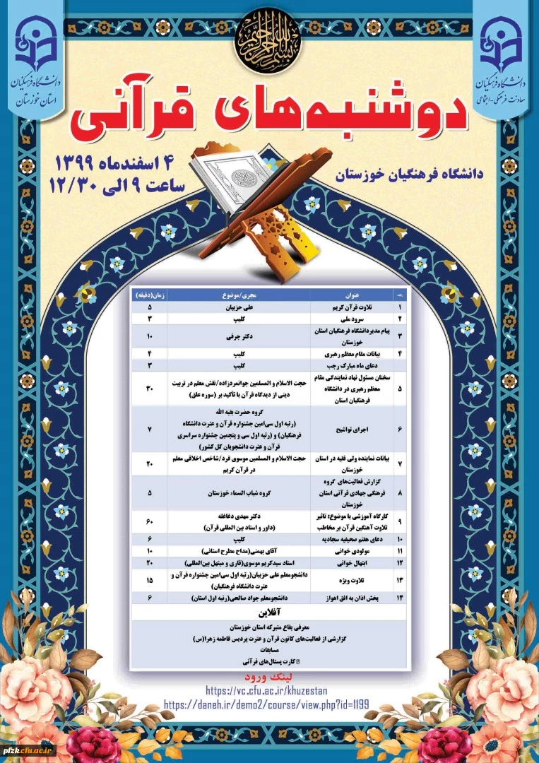 امتیاز دهید : طرح ملی دوشنبه های قرآن به میزبانی دانشگاه فرهنگیان خوزستان یکشنبه 3 اسفند 1399 ساعت 7:50