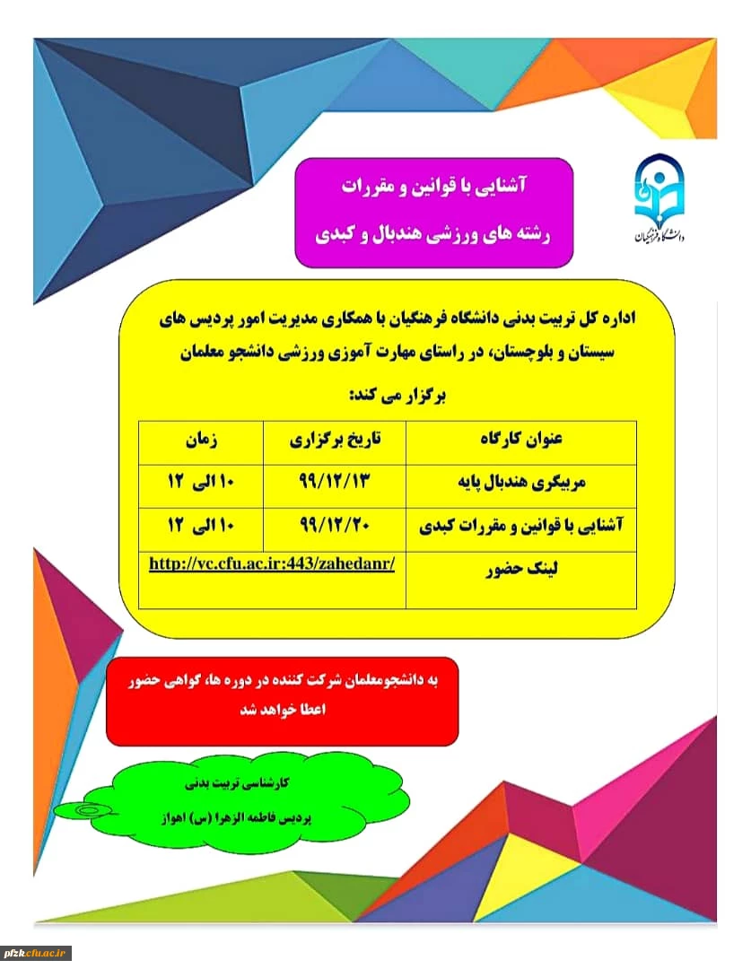 امتیاز دهید : کارگاه مربیگری هندبال پایه و آشنایی با قوانین و مقررات کبدی سهشنبه 12 اسفند 1399 ساعت 8:01