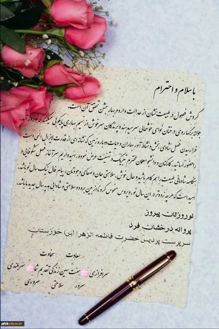 امتیاز دهید : پیام تبریک سرپرست پردیس حضرت فاطمه الزهرا(س) به مناسبت سال نو شنبه 30 اسفند 1399 ساعت 16:52