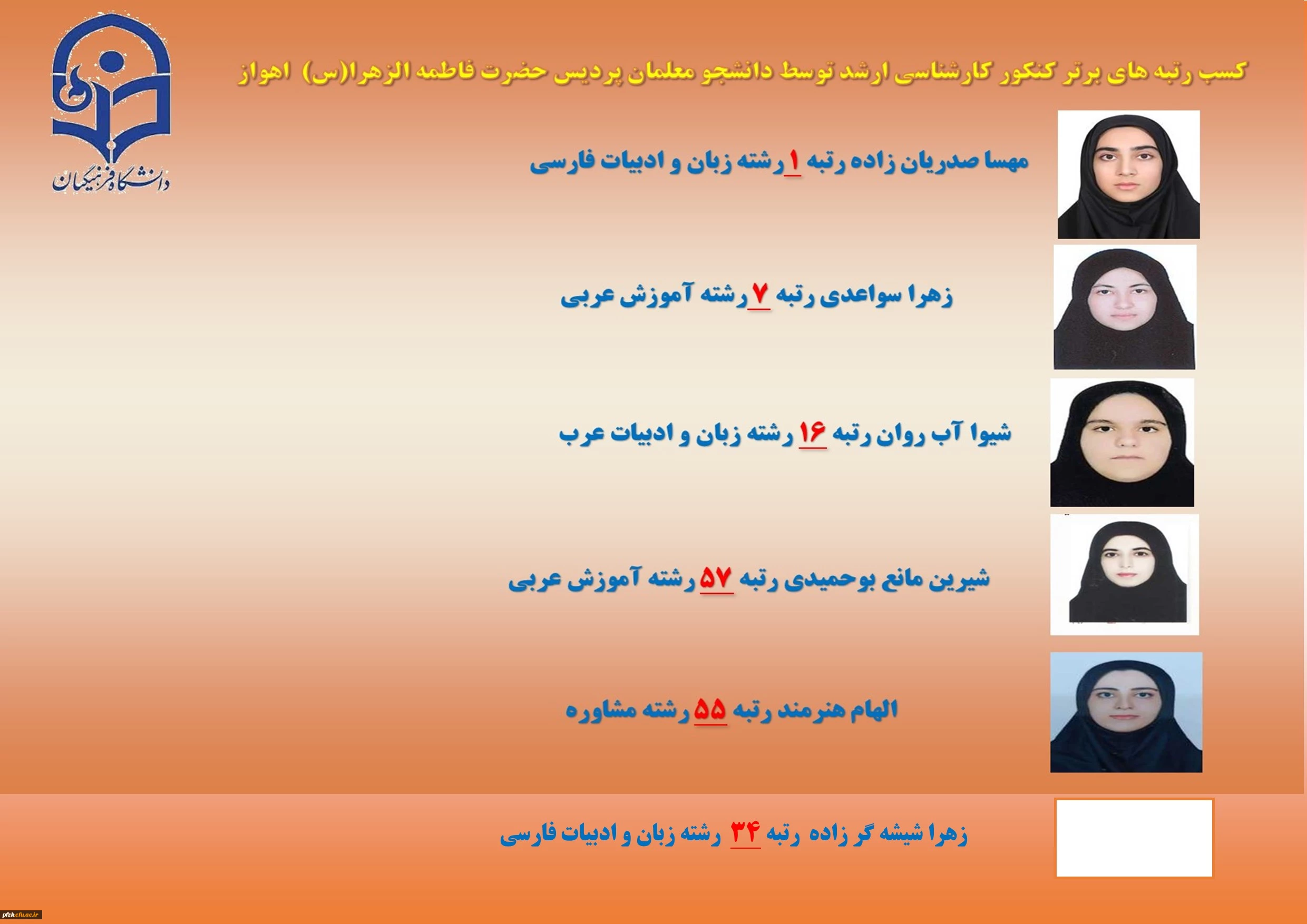 کسب رتبه های برتر کنکور کارشناسی ارشد توسط دانشجو معلمان پردیس حضرت فاطمه الزهرا(س) اهواز
