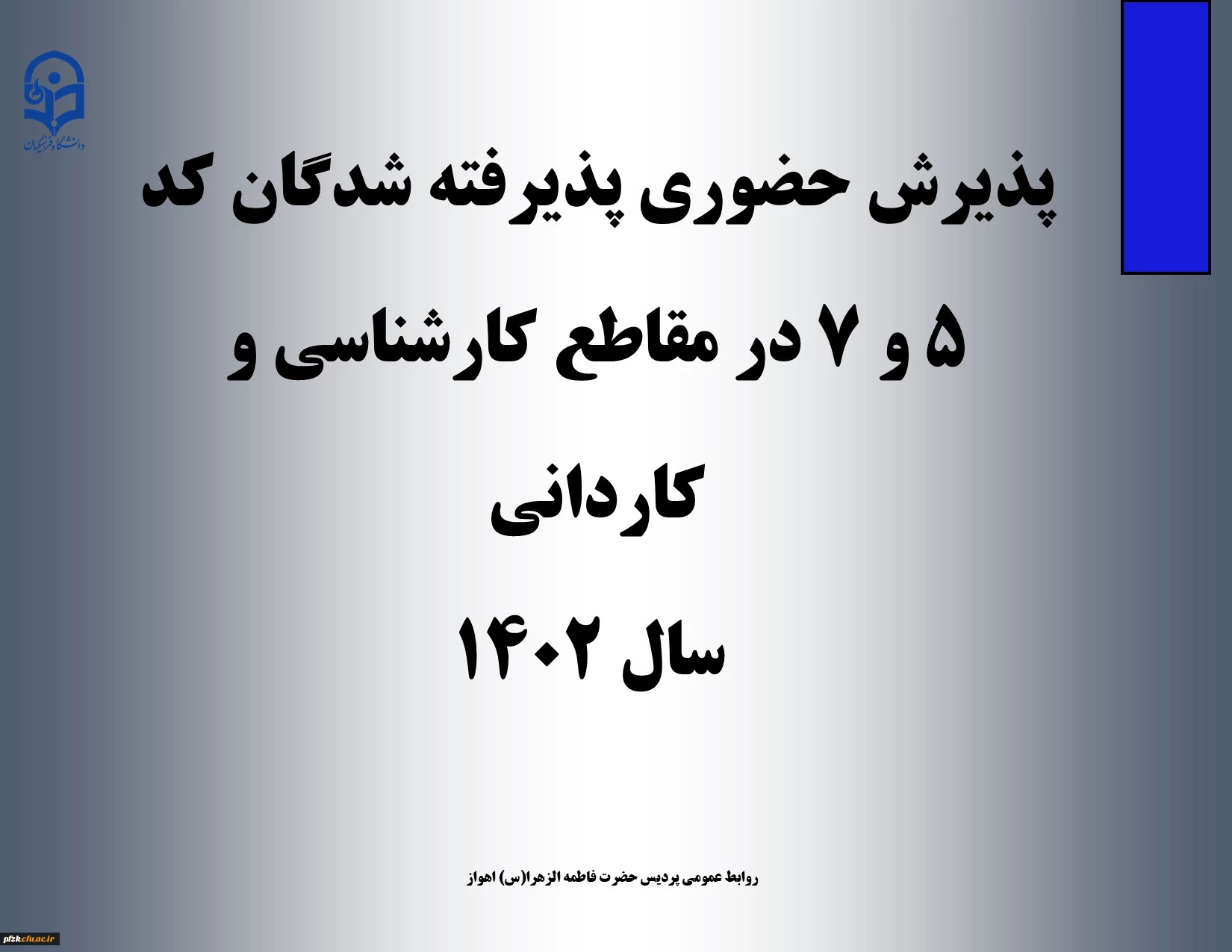 امتیاز دهید : پذیرش حضوری پذیرفته شدگان کد ۵ و ۷ در مقاطع کارشناسی و کاردانی سال ۱۴۰۲ سهشنبه 17 بهمن 1402 ساعت 14:46