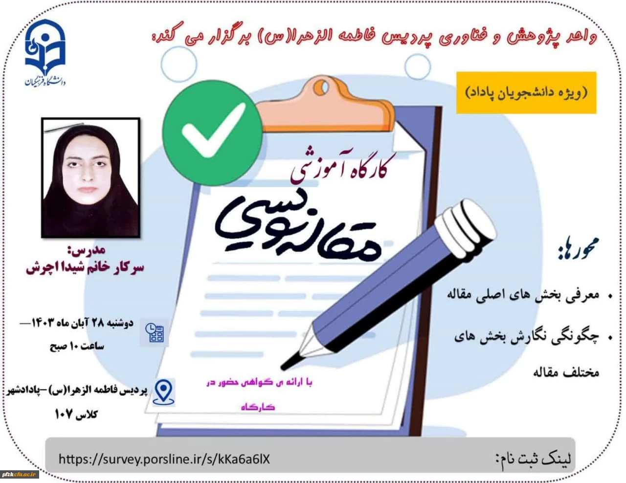 کارگاه "مقاله نویسی" با تدریس سرکار خانم شیدا اچرش