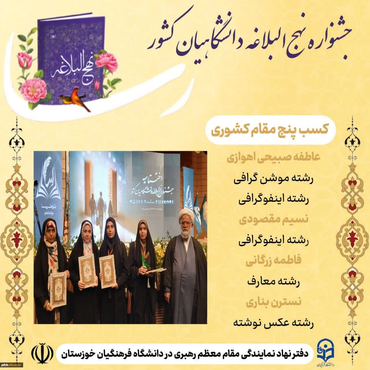 امتیاز دهید : درخشش دانشجومعلمان خوزستان در جشنواره ملی نهج البلاغه دانشگاهیان کشور( رسا) شنبه 4 اسفند 1403 ساعت 8:26