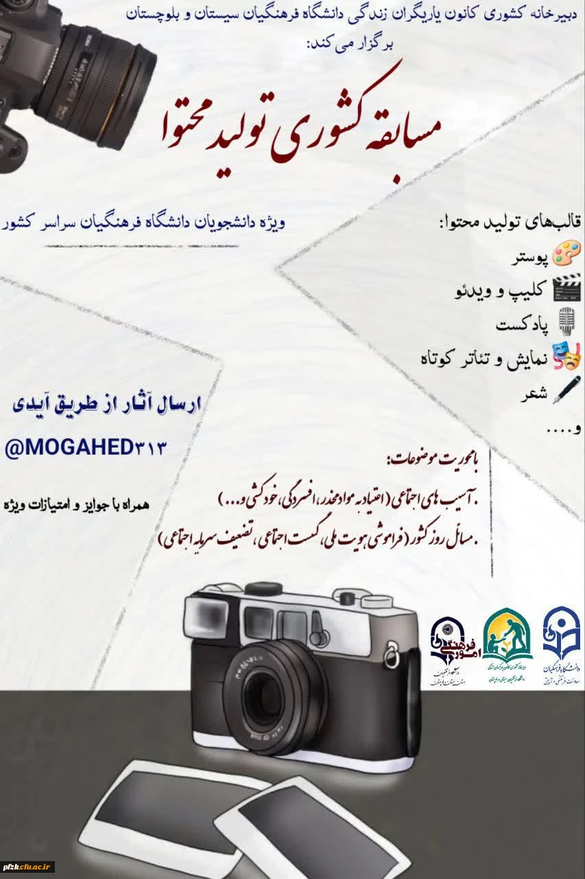 امتیاز دهید : مسابقه کشوری تولید محتوا ویژه دانشجویان دانشگاه فرهنگیان سراسر کشور دوشنبه 20 بهمن 1404 ساعت 13:17